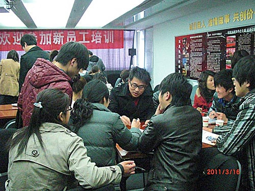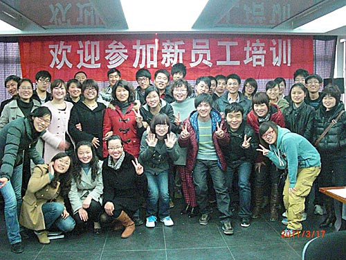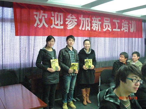 在“搶占資源”游戲中獲勝的新員工左起:韓曉慧、汪濤、曾璐。