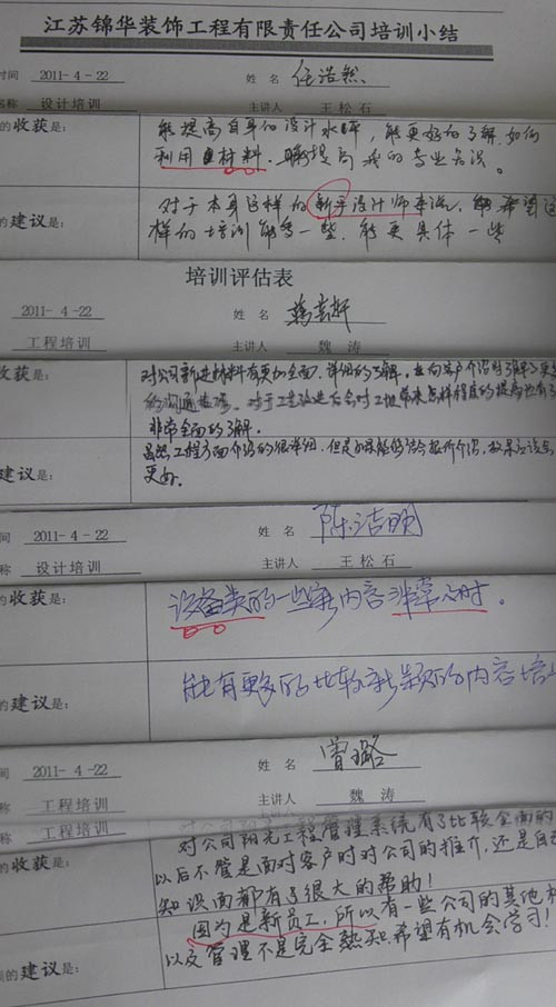 通過(guò)會(huì)后的培訓(xùn)調(diào)研,設(shè)計(jì)師普遍認(rèn)為收獲很大:一是設(shè)計(jì)的實(shí)用技巧和細(xì)節(jié)處理,二是讓設(shè)計(jì)師對(duì)新材料新設(shè)備有了最前沿的了解;三是對(duì)“陽(yáng)光工程”在設(shè)計(jì)師營(yíng)銷(xiāo)階段的運(yùn)用和增加客戶(hù)感知價(jià)值方面有了更新的認(rèn)識(shí)。當(dāng)然本次培訓(xùn)我們還收獲了不少建議(詳見(jiàn)附表)。通過(guò)我們收集的收獲和建議,我們還將整理出設(shè)計(jì)師的下一步培訓(xùn)需求,密切配合公司業(yè)務(wù)發(fā)展需要,在整體培訓(xùn)體系中做到及時(shí)調(diào)整,從而給予最大的支持和協(xié)助。