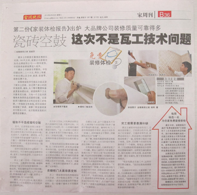 近日,南京知名媒體“金陵晚報(bào)”開通了“裝修體檢直通車”服務(wù),邀請廣大正在裝修中的業(yè)主報(bào)名,金陵晚報(bào)將和驗(yàn)房專家一起走進(jìn)業(yè)主家,驗(yàn)房后出具《家裝體檢報(bào)告》,幫助業(yè)主發(fā)現(xiàn)問題并解決問題。