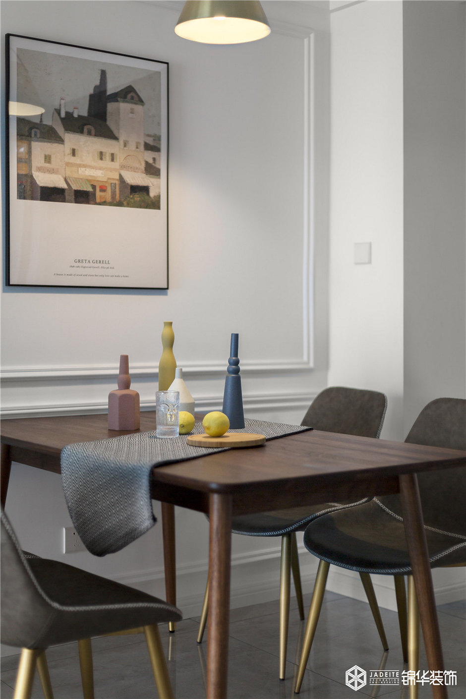 以pu線條代替造價甚高的護(hù)墻板,將其直接貼于墻面,增加了空間的層次感,其余的地方則是用不同色彩的墻紙體現(xiàn)空間的活潑性,呈現(xiàn)出空間本身的質(zhì)感與美感,白色和灰色的組合又使得整個空間安靜又舒適。