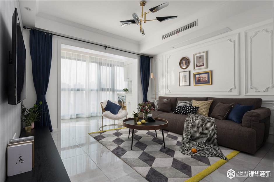 將陽臺空間納入室內(nèi),但因?yàn)樵柵_的梁無法拆除,如果將其全部遮蓋,客廳的整體高度會降低,設(shè)計師機(jī)智地做了一個美式經(jīng)典的格子頂,美觀實(shí)用,然后加已線條做出層次使客廳空間看起來高挑。