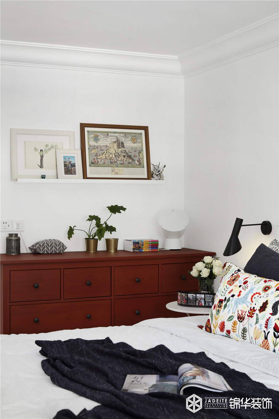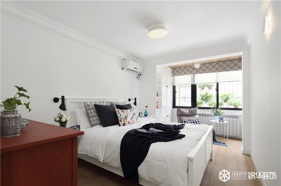 整個臥室空間以白色調(diào)為主,輔以恰到好處的醬紅色、木色等,再搭配以其他裝飾品等,讓整個空間看起來既寬敞舒適又格調(diào)十足。