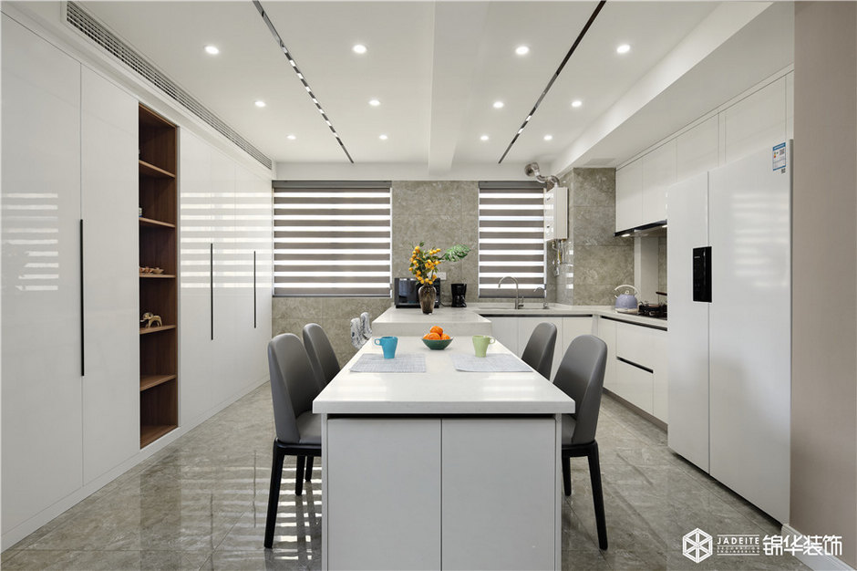 ▲吧臺將餐廳區(qū)域與廚房區(qū)域隔而不斷,讓空間呈現(xiàn)出不同的層次感,沒有過多阻擋,廚房的光線更加明亮!