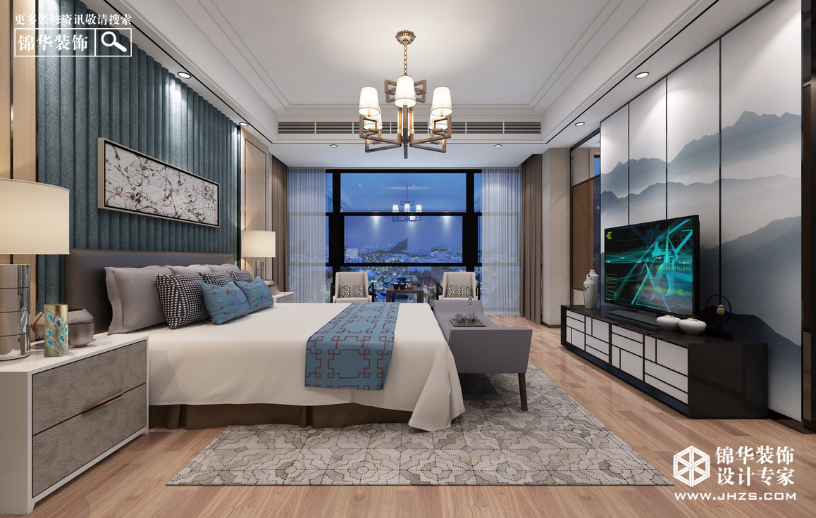 主臥并沒有因為自己是主人而特立獨行,它將藍色的主色調(diào)進行到底,主臥與衣帽間之間采用定制的中式水墨畫作為隔斷,門采用的是麻紗設(shè)計,讓整個空間既統(tǒng)一,又更加通透。